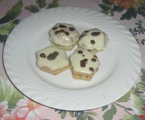 Ja som nemala kávové zrná, a keďže mi zvyšovala plnka, tak som ju ešte na vrch natrela a potom namáčala v bielej poleve. Navrch som ešte pofŕkala tmavou čokoládou.