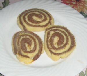 Obe cesta vypracujeme, necháme odpočinúť a potom z každého zvlášť vyvaľkáme slabší obdĺžnikový plát. Spodní plát potrieme rozšľahaným bielkom, hore položíme druhý plát a valčekom vytlačíme prípadné vzduchové bubliny. Horný plát tiež potrieme bielkom a zvinieme pevnú roládu, ktorú zatočíme do alobalu a necháme v chladničke stuhnúť. Potom ostrým nožom rovno nakrájame asi 5 mm široké plátky, ktoré dávame na plech vyložený papierom na pečenie a pečieme pri 170°C 8-10 minút. Potom už nezdobíme ani necukrujeme.