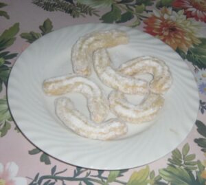 Vypracujeme cesto. Cesto dávame do mlynčeka a robíme rôzne tvary. Upečieme a obalíme v práškovom cukre alebo omočíme v čokoláde.